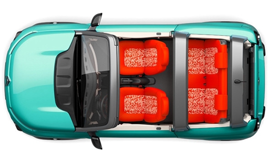關(guān)于內(nèi)飾方面,雪鐵龍E-MEHARI車內(nèi)采用四座布局,內(nèi)飾材質(zhì)多為塑料與織物,且提供米色與橘紅色兩種內(nèi)飾配色。另外,其后排座椅可折疊放倒,以擴(kuò)展儲物空間。