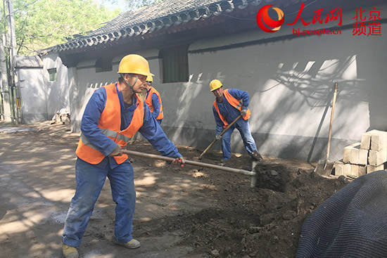 金融街街道西斜街42號(hào)院門前,十幾名工人正在挖溝鋪設(shè)弱電線纜管道。人民網(wǎng) 鮑聰穎 攝