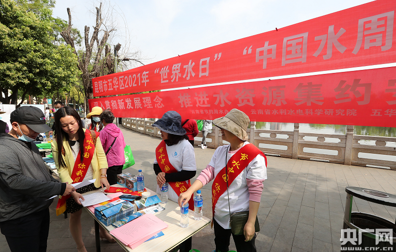 2021年3月20日,昆明開展“世界水日”“中國(guó)水周”宣傳活動(dòng)。在翠湖公園“宣傳現(xiàn)場(chǎng),節(jié)水宣傳志愿者為市民開展“節(jié)約用水、珍惜資源”科普宣傳服務(wù)(央廣網(wǎng)發(fā) 圖片來源:CFP)