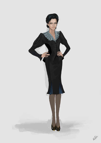 《佩小姐的奇幻城堡》電影中分別有兩個時間點(diǎn),1943年和2016年,柯琳需要準(zhǔn)備兩個時代的服裝,復(fù)古與現(xiàn)代時尚的融合是這部電影的一大美術(shù)特點(diǎn)。從曝光的劇照來看,愛娃·格林飾演的“佩小姐”的妝容就是復(fù)古時期的經(jīng)典代表,而她的服裝又給她的角色制造了更多神秘感。