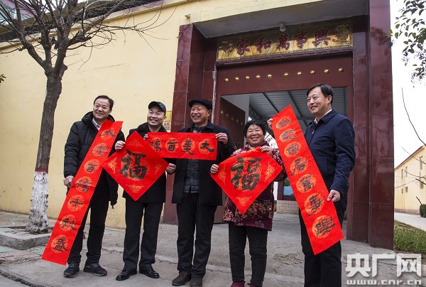 根據(jù)結(jié)尾字聲調(diào)的平仄區(qū)分出上聯(lián)和下聯(lián)后,還需注意張貼的形式。當(dāng)人們面對春聯(lián)時,上聯(lián)在右首,下聯(lián)在左首。兩聯(lián)呈對稱的形式,貼在相對的位置。事實(shí)上,這多是對“框?qū)Α保ㄙN在左右門框上的春聯(lián))和“門心”(貼在左右門板上方居中位置的春聯(lián))的張貼要求。但“門心”與“框?qū)Α边略有不同。在書寫形式上,“門心”的兩聯(lián)各有兩列字,上聯(lián)是由右往左書寫,下聯(lián)是由左往右書寫,兩聯(lián)相對。張貼出去,像繁體的“門”字。比如,人們面對七言的“門心”時,春聯(lián)兩側(cè)各是四言,中間則是三言。如果稍加關(guān)注“門心”的平仄格式和書寫形式,一般不易張貼錯誤。
