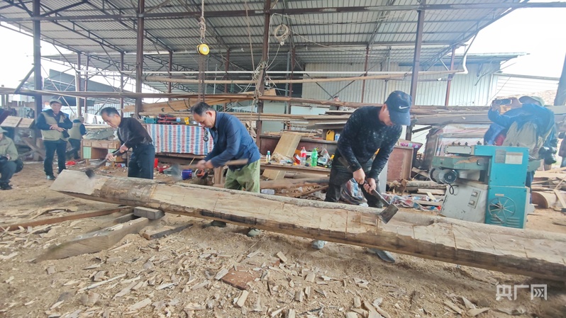 水密隔艙福船制造基地內(nèi),水密隔艙福船制造技藝第二十代傳承人劉細(xì)秀(左一)正在制作福船(央廣網(wǎng)記者 張子劍 攝)