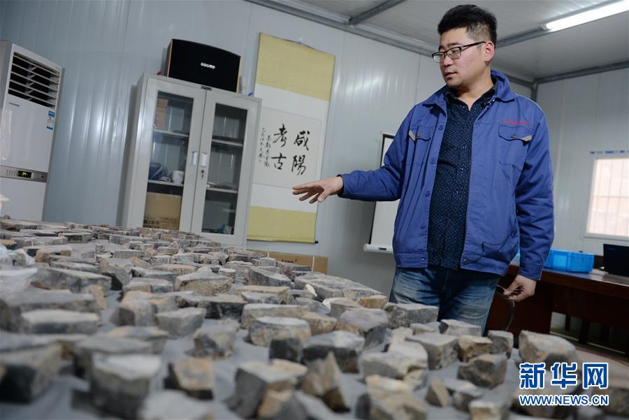 陜西考古研究院助理研究員張楊力錚介紹秦咸陽(yáng)城胡家溝建筑遺址出土的石磬(1月24日攝)。近日,考古工作者首次在秦咸陽(yáng)城遺址區(qū)域內(nèi)發(fā)現(xiàn)秦代大型國(guó)家府庫(kù)遺存。這是繼20世紀(jì)70至80年代發(fā)掘秦咸陽(yáng)宮遺址以來(lái),在秦咸陽(yáng)大遺址保護(hù)區(qū)內(nèi)再次發(fā)現(xiàn)秦代大型官署建筑遺址。此次發(fā)現(xiàn)的遺址位于陜西省西咸新區(qū)秦漢新城窯店鎮(zhèn),地處秦都咸陽(yáng)城宮區(qū)以西的胡家溝塬地。遺址建筑四面為夯土垣墻,墻體厚度約3米,寬19.5米,總長(zhǎng)110米。發(fā)掘過(guò)程中出土了數(shù)量眾多的石質(zhì)編磬殘塊,目前已在23件殘塊上發(fā)現(xiàn)了小篆“北宮樂(lè)府”等字樣,再次證實(shí)了秦代設(shè)樂(lè)府的史實(shí)。新華社記者 李一博 攝 -