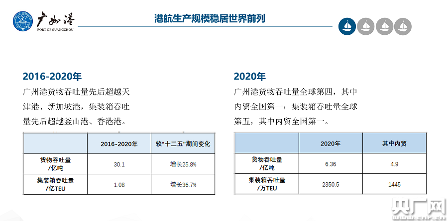 2020年,廣州港貨物吞吐量6.36億噸,全球第四,其中內(nèi)貿(mào)4.9億噸,全國(guó)第一;集裝箱吞吐量2350.5萬(wàn)TEU,全球第五,其中內(nèi)貿(mào)1445萬(wàn)標(biāo)箱,全國(guó)第一。