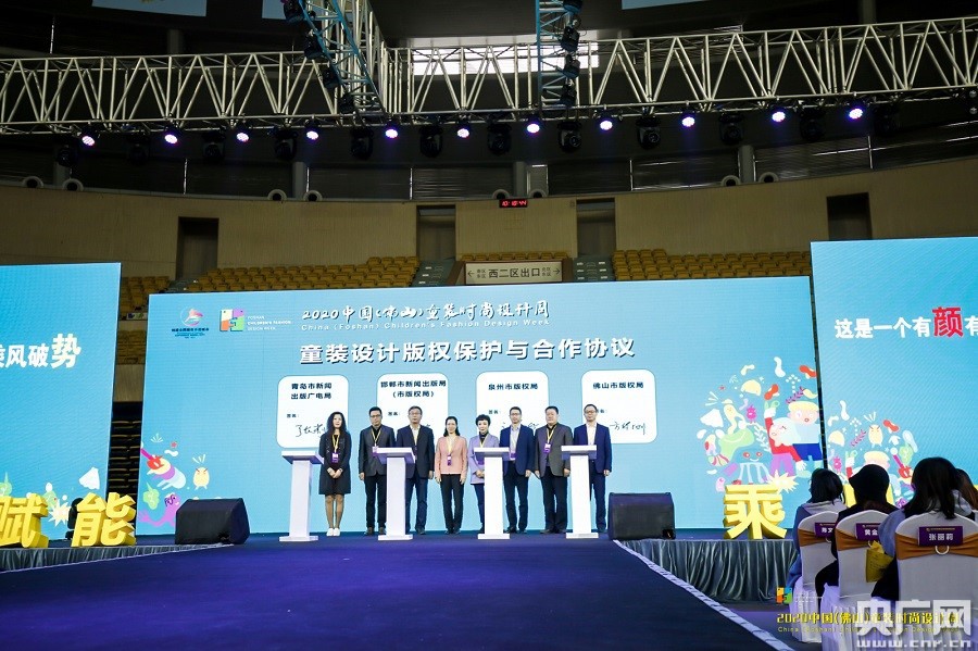 佛山、青島、邯鄲、泉州四地版權(quán)主管部門簽署童裝版權(quán)保護(hù)合作框架協(xié)議。(央廣網(wǎng)發(fā) 主辦方供圖)