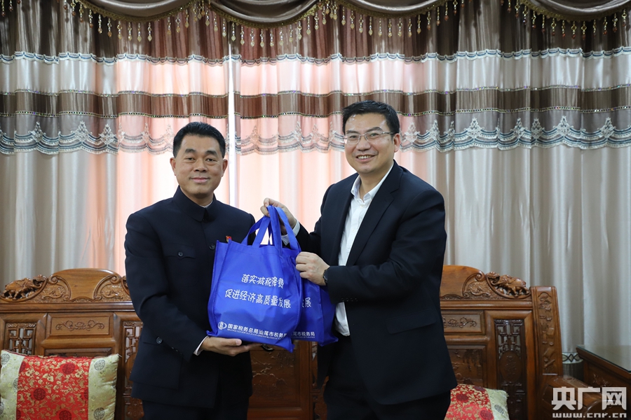 汕尾市稅務局黨委委員、總經濟師郭郁(右)為全國人大代表李金東(左)送上稅費政策大禮包。(央廣網發(fā))