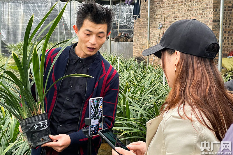 正在蘭花基地直播的人員。(央廣網(wǎng)記者 官文清 攝)