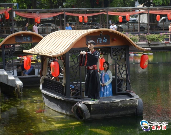 入場儀式過后,上演“彈絲樂禮”古箏彈唱表演,古代君王們功業(yè)成就才做樂,天下平定了才成禮。隨后接著的“嶺南舞韻”更是增添了宴會(huì)上的歡愉氣氛。在紅云宴期間湖面上還有緩緩行駛的一條船,船上一人舉酒杯,一人捧酒缽。船隨岸而行,每到坐客處即停。客人便取杯飲酒,將杯還給舉酒杯的人,捧酒缽人斟酒滿杯,船再前行。