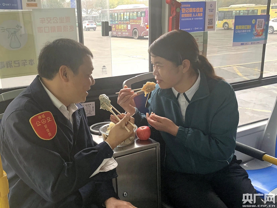 下午17:30分,胡幼瓊準(zhǔn)時(shí)來到郊邊總站等著丈夫,這是晚班的吃飯時(shí)間。沒多久,覃重章就駕駛著118路公交車進(jìn)站,路上車少,他比預(yù)定時(shí)間提早了回來,但胡幼瓊還是抓緊時(shí)間拿著餃子上車。今年的年夜飯,她特意包了“三鮮”“韭菜豬肉”兩種餃子餡,“因?yàn)樗麗鄢匀r,所以我特別多做了幾只”,胡幼瓊還帶了大紅蘋果給丈夫,寓意“平平安安”。兩人在車廂中一邊吃著年夜飯,一邊通過手機(jī)和在老家的小兒子視頻聊天嘮家常。