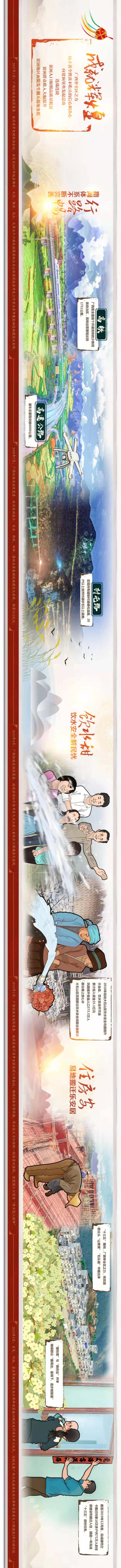 長(zhǎng)卷分為“久困于窮”“戰(zhàn)天斗地”“成就輝煌”三個(gè)篇章,既著眼于宏大敘事,也囊括了“豬籠洞”“天等不等天”等脫貧特寫(xiě),以及黃文秀、陳開(kāi)枝等戰(zhàn)貧人物的微觀特寫(xiě);既包含了30多年來(lái)“廣西扶貧大事記”時(shí)間軸形式的線性梳理,也有展現(xiàn)廣西貧困群眾從行路、飲水、住房、上學(xué)、就醫(yī)、用電、增收的“七難”到行路暢、飲水甜、住房安、上學(xué)便、就醫(yī)惠、用電易、增收快的“七巨變”的場(chǎng)景式鏡頭。