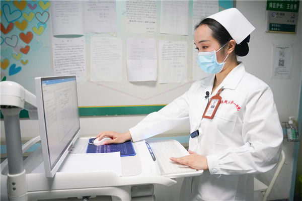 江淀淀在智能移動護(hù)理站查看病人信息(央廣網(wǎng)發(fā) 尚天宇攝)