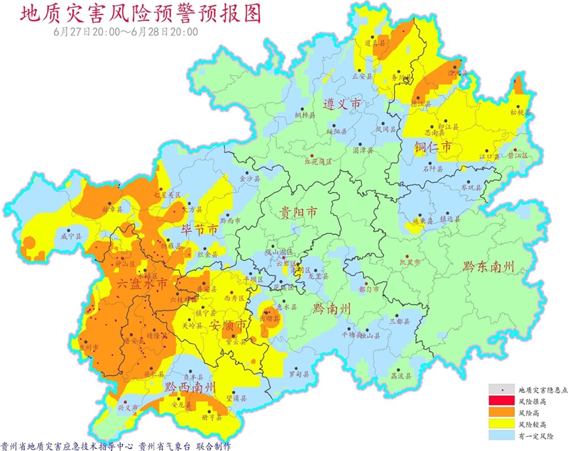 根據(jù)中國氣象局和省氣象臺最新氣象預報,未來一周貴州將迎來今年入汛以來最大一輪強降雨天氣過程。經(jīng)貴州省地質(zhì)災害防治指揮部辦公室組織專家分析研判,全省地質(zhì)災害氣象風險等級較高,防治形勢嚴峻。按照《貴州省地質(zhì)災害應急預案》相關規(guī)定,貴州省地質(zhì)災害防治指揮部辦公室決定,從6月27日12時起,啟動貴州省地質(zhì)災害風險二級預警。