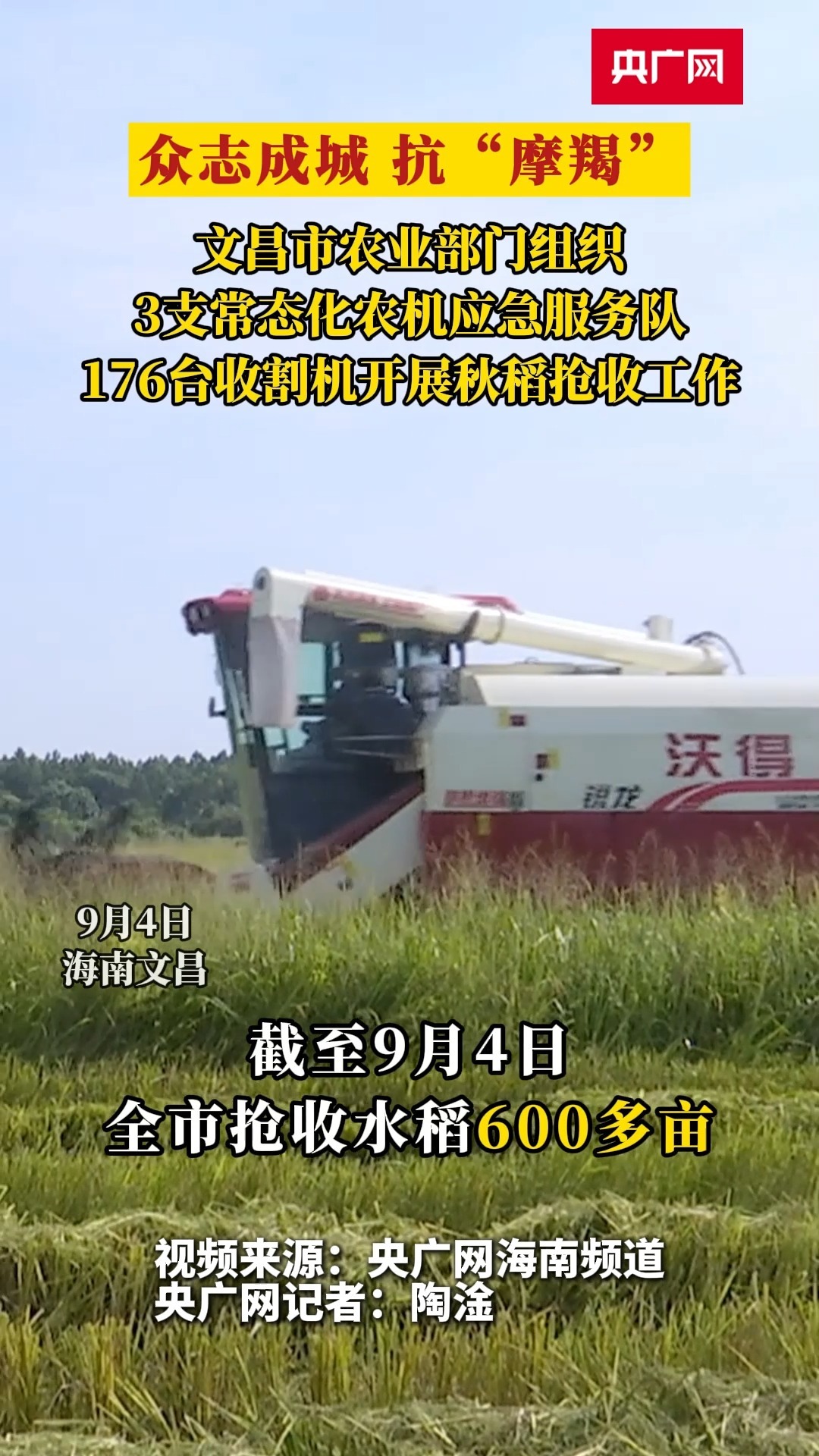 防范應(yīng)對(duì)臺(tái)風(fēng)“摩羯” 海南文昌搶收水稻600多畝