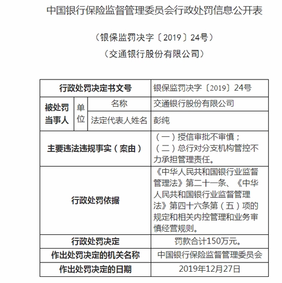 據(jù)中國(guó)銀行保險(xiǎn)監(jiān)督管理委員會(huì)官網(wǎng)1月8日發(fā)布的行政處罰信息(銀保監(jiān)罰決字〔2019〕24號(hào))處罰文書(shū)顯示,交通銀行股份有限公司因授信審批不審慎及總行對(duì)分支機(jī)構(gòu)管控不力承擔(dān)管理責(zé)任等違法違規(guī)事實(shí),依據(jù)《中華人民共和國(guó)銀行業(yè)監(jiān)督管理法》第二十一條、《中華人民共和國(guó)銀行業(yè)監(jiān)督管理法》第四十六條第(五)項(xiàng)的規(guī)定和相關(guān)內(nèi)控管理和業(yè)務(wù)審慎經(jīng)營(yíng)規(guī)則條例作出罰款150萬(wàn)元的行政處罰決定。