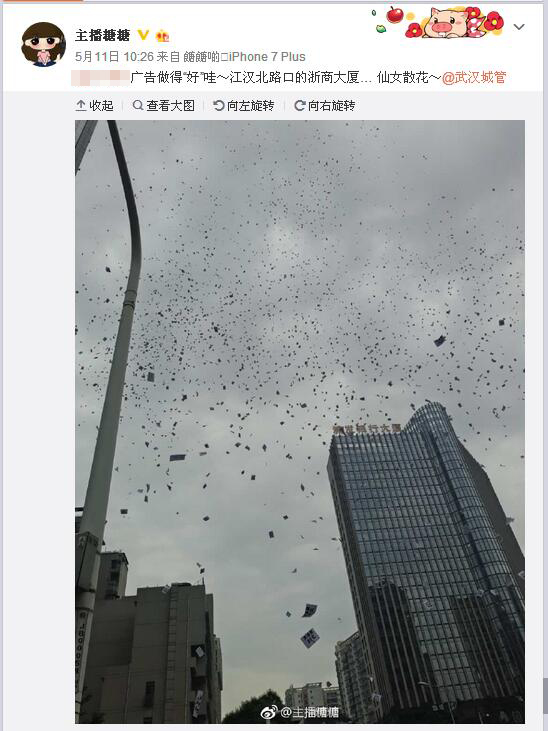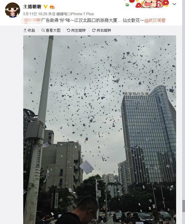 楚天金報(bào)訊(記者林晶)為了生意好做,男子竟在49樓樓頂,一把撒下5000張小廣告。昨日上午10時(shí),這奇葩一幕發(fā)生在江漢北路,引來路人圍觀。該男子也因此遭到處罰!皬V告做得‘好’啊”,昨日,網(wǎng)友“主播糖糖”發(fā)微博稱,江漢北路有人撒小廣告,猶如仙女散花,“廣告效益不知道,負(fù)面宣傳效果已經(jīng)達(dá)到了”。照片顯示,無數(shù)的小廣告從天而降,鋪滿了江漢北路和新華路。該網(wǎng)友當(dāng)即@武漢城管。