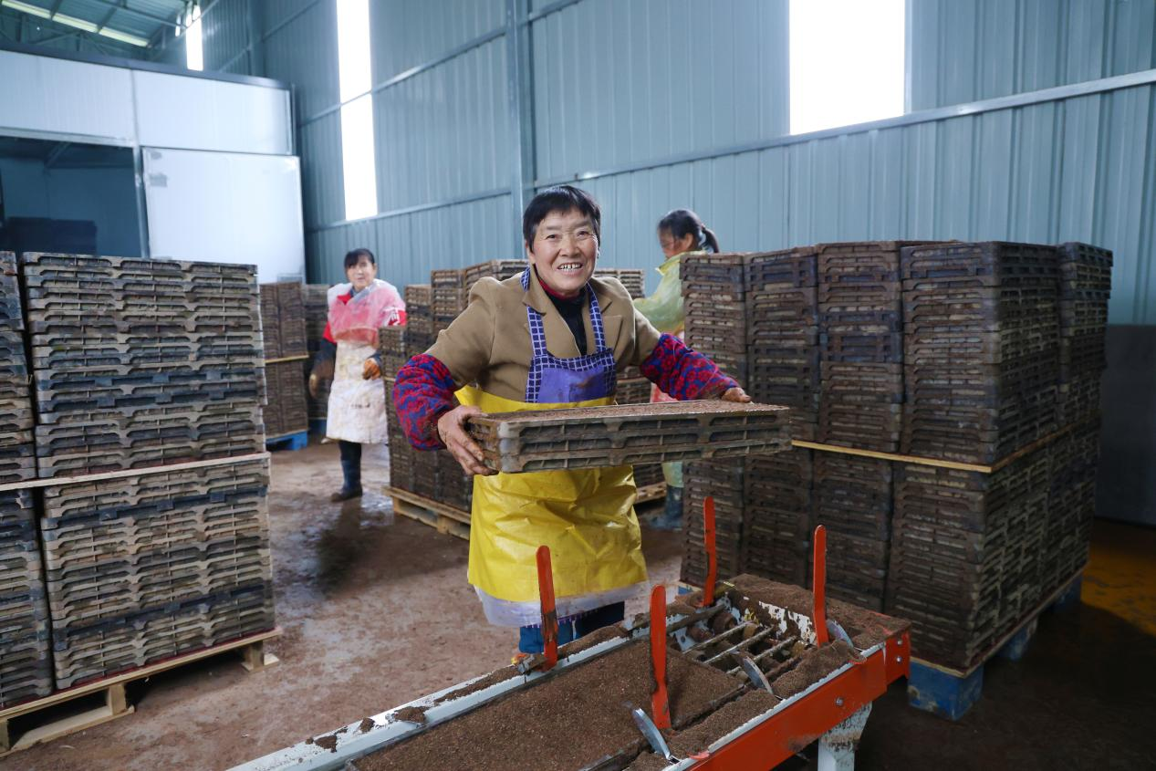 育秧車間內,工人們在全自動育秧流水線上有條不紊地忙碌(唐文峰 攝)