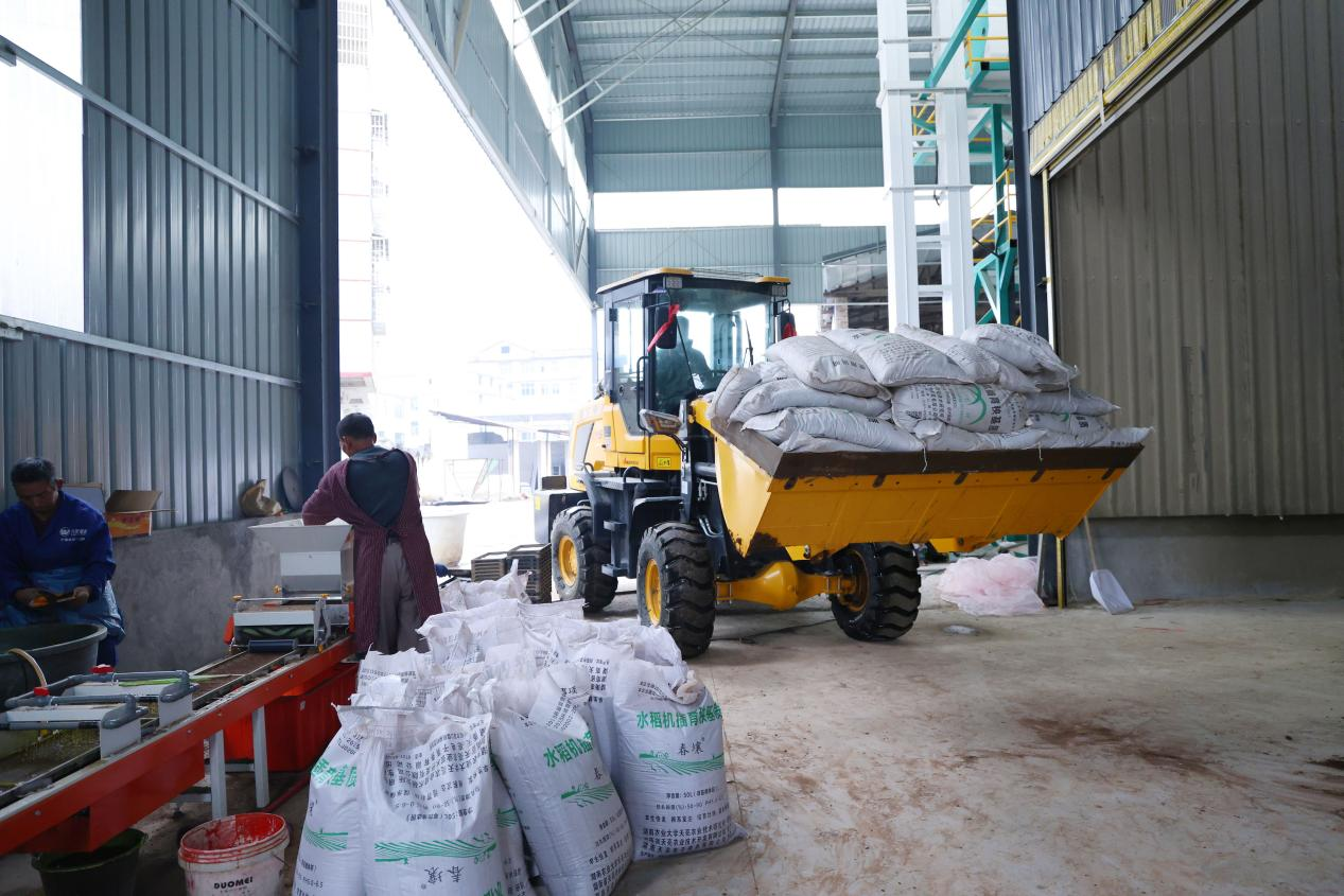 育秧車間內,農機手駕駛著車輛運送育秧基質(屈凌芙蓉 攝)