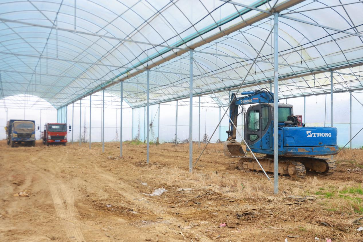 育秧大棚中,農機手們駕駛著農機平整土地,方便后續(xù)擺放秧盤(謝玉玲 攝)