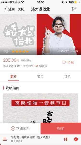 6月12日,蜻蜓FM推出《矮大緊指北》,一檔由高曉松聊"詩與遠方"的音頻付費節(jié)目火了。此前,《曉說》、《曉松奇談》等節(jié)目為高曉松積累了一票粉絲,已然成為具有號召力的強勢IP。此前,蜻蜓FM上線的高曉松免費音頻,累計播放量達9億。這些前期的免費內(nèi)容已經(jīng)為高曉松的IP質(zhì)量打下了基礎,粉絲不需要擔心購買的內(nèi)容是不是自己所需要的,不需要戰(zhàn)戰(zhàn)兢兢擔心內(nèi)容質(zhì)量是否優(yōu)秀且穩(wěn)定,高曉松提供的知識+情懷已經(jīng)順理成章的從免費走向付費。
