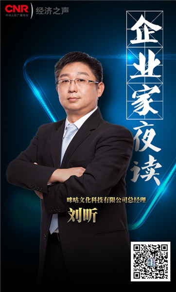 導(dǎo)讀:2018年,中央人民廣播電臺(tái)經(jīng)濟(jì)之聲全新推出《企業(yè)家夜讀》,這是一檔面對(duì)企業(yè)家群體及關(guān)心關(guān)注這個(gè)群體朋友們的閱讀朗讀節(jié)目。每周日晚九點(diǎn),我們都會(huì)相聚在電波里。今天做客《企業(yè)家夜讀》的,是咪咕文化科技有限公司總經(jīng)理劉昕。