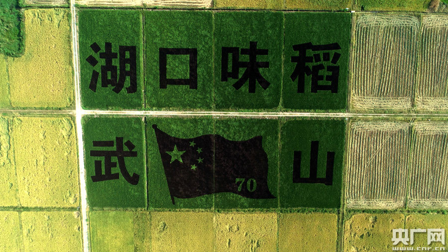 央廣網(wǎng)湖口9月18日消息(記者鄧玉玲 通訊員鄭飛華)9月17日,湖口縣武山鎮(zhèn)武前村金黃稻浪層層疊疊,從高空俯瞰,猶如“大地染金”,與稻田里的巨幅書(shū)畫(huà)、秀美的山川、美麗的村莊相映成趣,點(diǎn)綴著秋收的大地,美不勝收。