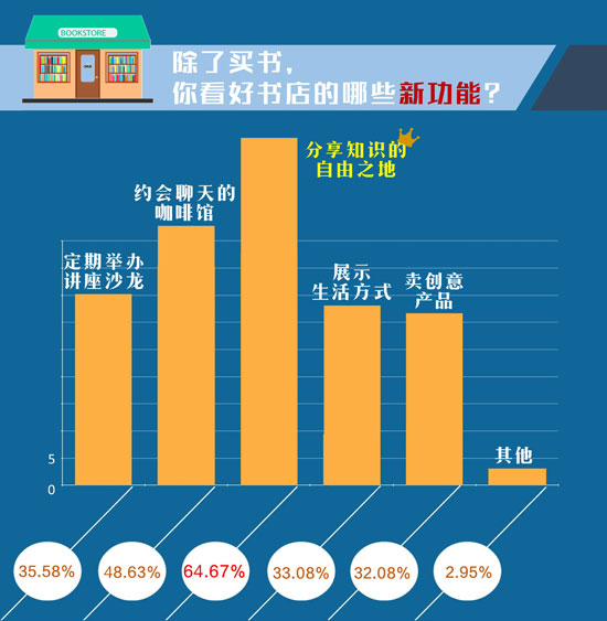 中國青年報社會調(diào)查中心通過問卷網(wǎng),對2001名受訪者進(jìn)行的一項調(diào)查發(fā)現(xiàn),70.8%的受訪者認(rèn)為實體書店對消費(fèi)者仍然有吸引力。64.7%的受訪者希望書店是分享知識的自由之地,48.6%的受訪者則希望書店成為約會聊天的咖啡館。