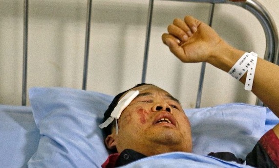 昨日下午3時(shí)30分許,長安醫(yī)院急診科病床上,老楊的兒子躺在床上,左手半握拳搭在額頭,右額頭上貼著紗布,右眼角周邊淤血痕跡明顯,面部也有多處淤血。病床上的診斷顯示:閉合性顱腦損傷,顏面部皮膚組織挫裂傷,鼻外傷。老楊說,兒子一直說腹腔部疼痛、頭疼,病情還需要進(jìn)一步診斷。
