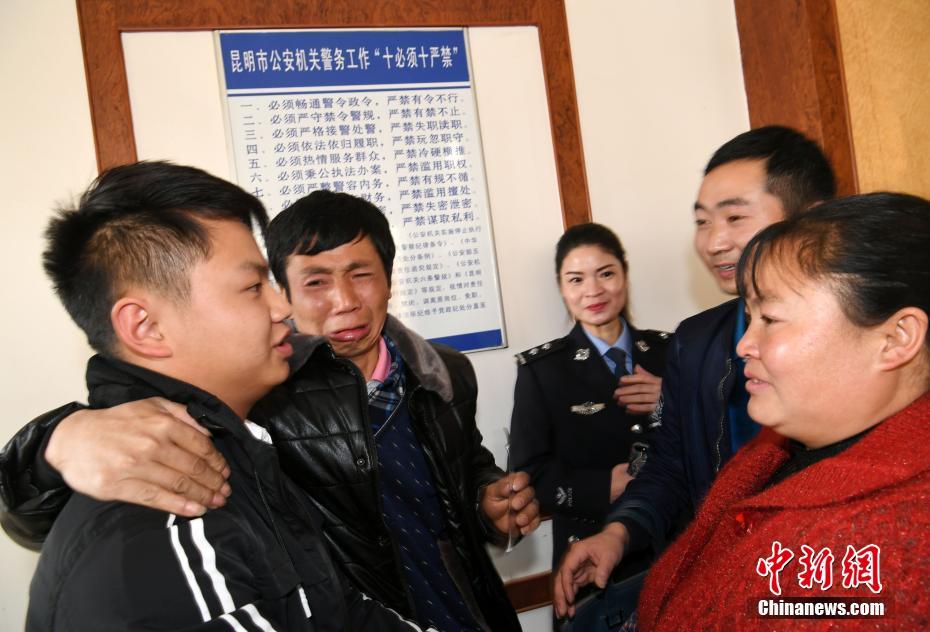 2月23日,小周和親生父母相見時,父母淚流滿面。當(dāng)日,20年前在貴州省失蹤的周躍欽夫婦2歲半兒子小周,在貴州和云南兩省警方努力幫助下,通過DNA血樣比對成功,現(xiàn)在已經(jīng)22歲的小周與自己的親生父母、弟弟在昆明團(tuán)聚,一家人相擁而泣。這些年來,周躍欽夫婦一直沒有放棄找兒子,并將自己的DNA血樣在公安機(jī)關(guān)進(jìn)行采集備案。為了找到親生父母,2016年,小周也在昆明市公安局進(jìn)行了DNA和指紋采集。據(jù)介紹,采血入庫比對,是被拐孩子尋親的捷徑。中新社記者 李進(jìn)紅 攝
