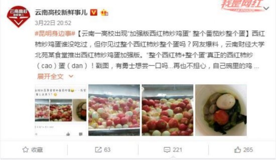 22日晚,微博用戶“云南高校新鮮事兒”發(fā)布了一條博文稱“網(wǎng)友爆料,云南財(cái)經(jīng)大學(xué)北苑某食堂推出西紅柿炒雞蛋加強(qiáng)版,整個(gè)西紅柿+整個(gè)蛋”,引得微博用戶紛紛轉(zhuǎn)發(fā)。云南財(cái)經(jīng)大學(xué)的學(xué)生們秒變“段子手”,紛紛在博文評(píng)論中吐槽、逗趣、認(rèn)校友.....。。