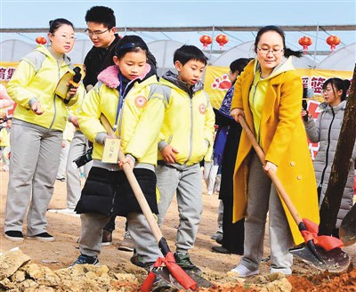 2月4日是農(nóng)歷二十四節(jié)氣之首的“立春”,湖南長(zhǎng)沙諾貝爾搖籃少年兒童農(nóng)場(chǎng)舉辦傳統(tǒng)迎春禮等活動(dòng),再現(xiàn)長(zhǎng)沙消失100多年的迎春禮場(chǎng)面。圖為孩子們?cè)诜N樹(shù)。