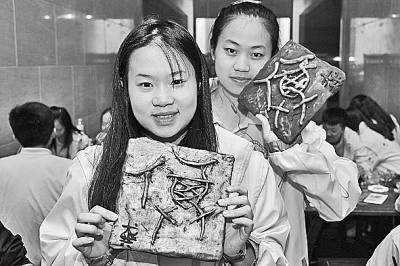 山東煙臺(tái)王懿榮紀(jì)念館,菲律賓華裔青少年在展示制作的甲骨文“!弊帧P氯A社發(fā)