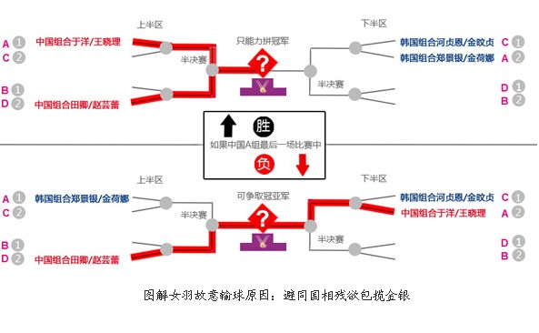 由于中國(guó)隊(duì)的另外一對(duì)組合田卿/趙蕓蕾以3戰(zhàn)2勝的成績(jī)奪取了小組賽D組第二的成績(jī)出線,所以他們淘汰賽中的第一個(gè)對(duì)手將是中華臺(tái)北的程文欣/簡(jiǎn)毓瑾組合,如果能夠戰(zhàn)勝對(duì)手而進(jìn)入下一輪,那么他們將迎來(lái)A組第一名和D組第二名之間的勝者,也就是說(shuō),如果A組的中國(guó)選手于洋/王曉理今在今晚的比賽中戰(zhàn)勝韓國(guó)組合鄭景銀/金荷娜的話,那么于洋/王曉理將奪取A組小組第一的位置,這樣的話,這兩隊(duì)中國(guó)選手就等于說(shuō)被分在了同一個(gè)半?yún)^(qū),也就是說(shuō)在決賽之前中國(guó)隊(duì)將要提前“自相殘殺”