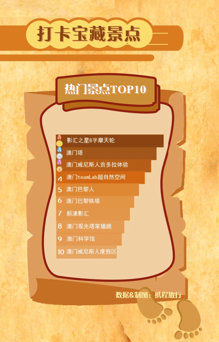 澳門超級多的美景游客也不應(yīng)錯過。從數(shù)據(jù)中可看出:影匯之星8字摩天輪、澳門塔、澳門威尼斯人貢多拉體驗、澳門teamLab超自然空間、澳門巴黎人、澳門巴黎鐵塔、新濠影匯、澳門觀光塔笨豬跳(蹦極跳)、澳門科學(xué)館、澳門威尼斯人度假區(qū)是游客喜愛的Top10熱門景區(qū)。