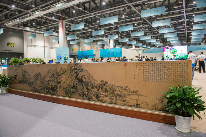 新聞中心檔板上的《富春山居圖》被譽(yù)為“中國(guó)十大傳世名畫”之一,是元代畫家黃公望的代表作,以浙江富春江為背景,全圖用墨淡雅,山和水的布置疏密得當(dāng),墨色濃淡干濕并用,極富于變化。明朝末年傳到收藏家吳洪裕手中,吳洪裕極為喜愛(ài)此畫,甚至在臨死前下令將此畫焚燒殉葬,被吳洪裕的侄子從火中搶救出,但此時(shí)畫已被燒成一大一小兩段。較長(zhǎng)的后段稱《無(wú)用師卷》,現(xiàn)藏臺(tái)北故宮博物院;前段稱《剩山圖》,現(xiàn)收藏于浙江省博物館。