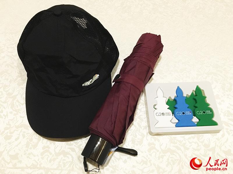G20媒體包中的帽子、傘以及冰箱貼(人民網(wǎng)記者賈興鵬攝)