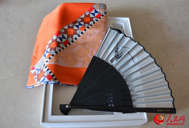 G20媒體包中的杭扇與絲巾(人民網(wǎng)記者夏曉倫攝)
