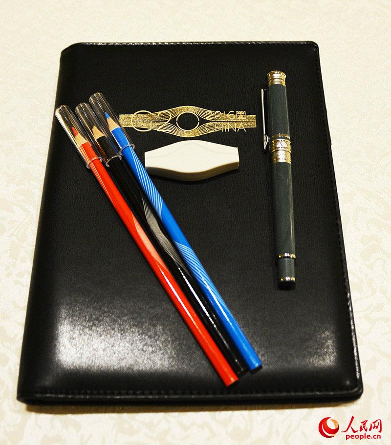 黑色皮革的筆記本,印著燙金G20標(biāo)志。紅藍(lán)黑三色木質(zhì)鉛筆,搭配著白色小清新橡皮。