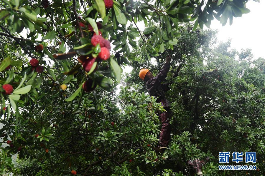 6月13日,慈溪市橫河鎮(zhèn)龍南村農(nóng)戶冒雨采摘楊梅。近日,被稱為“中國楊梅之鄉(xiāng)”的浙江省慈溪市進(jìn)入楊梅成熟期,楊梅將批量上市,也吸引了不少游客前來采摘。目前慈溪市楊梅栽培面積達(dá)8萬多畝,年產(chǎn)量約3萬噸,品質(zhì)出眾,遠(yuǎn)銷各地。楊梅種植使農(nóng)戶增收致富,楊梅采摘游也成為當(dāng)?shù)氐囊粡執(zhí)厣糜蚊。新華社記者 黃宗治 攝 -