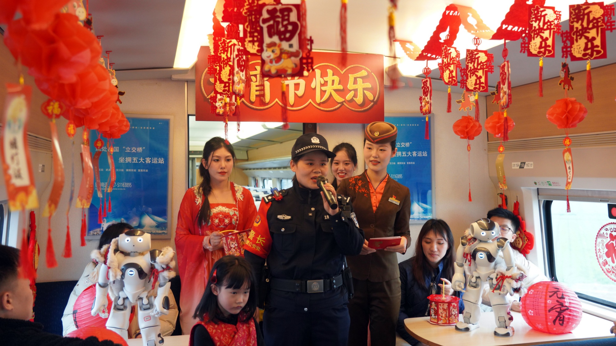 “這花燈設(shè)計(jì)的真好看,還有反詐燈謎呢!3月3日農(nóng)歷正月十五元宵節(jié),在漢口開往宜昌東的D5803次列車上,列車乘警、列車員與智能機(jī)器人一同和乘車旅客互動聯(lián)歡,一場別開生面的“移動元宵”主題活動在車廂里正式拉開帷幕。猜燈謎、機(jī)器人舞蹈、旅客小朋友朗誦、乘警反詐順口溜、送湯圓……一個(gè)個(gè)有趣的活動,讓大家在溫馨旅途中共度元宵佳節(jié),暖意滿滿。車廂里的歡聲笑語也隨著飛馳的列車奔向千家萬戶。