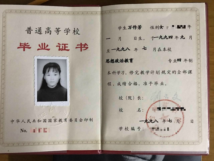 1994級考生萬作芳的大學(xué)畢業(yè)證書