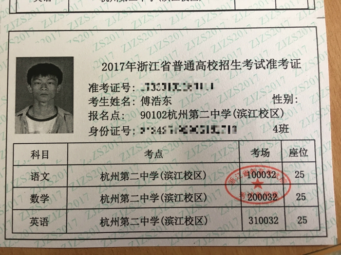 2017級考生傅浩東的準(zhǔn)考證