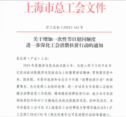2020年9月9日,上海市總工會下發(fā)《關于增加一次性節(jié)日慰問額度進一步深化工會消費扶貧行動的通知》(上海市總工會官網(wǎng)截圖)