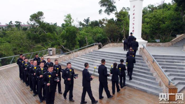 上午10時許,萬山邊檢站的移民警察手持菊花,神情凝重地敬獻在桂山艦烈士紀念碑前,并通過列隊肅目、鞠躬、默哀,深切緬懷烈士的光輝業(yè)績,追思他們英勇頑強、不怕犧牲、無私奉獻、忠誠為民的革命精神。