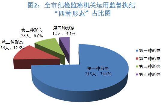 全市紀(jì)檢監(jiān)察機(jī)關(guān)運(yùn)用監(jiān)督執(zhí)紀(jì)“四種形態(tài)”處理289人次。其中,第一種形態(tài)215人次,占“四種形態(tài)”處理總?cè)藬?shù)的74.4%;第二種形態(tài)36人次,占“四種形態(tài)”處理總?cè)藬?shù)的12.5%;第三種形態(tài)26人次,占“四種形態(tài)”處理總?cè)藬?shù)的9.0%;第四種形態(tài)12人次,占“四種形態(tài)”處理總?cè)藬?shù)的4.1%。