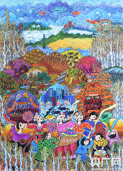 據(jù)了解,此次現(xiàn)場展出的300幅農(nóng)民畫作品,全部以美麗鄉(xiāng)村為主題。既有大視角、大手筆呈現(xiàn)改革開放40年來“三農(nóng)”的發(fā)展變化和輝煌成就的,也有多角度、小場景展示農(nóng)民生產(chǎn)、生活提高和共享改革開放豐碩成果的。作品不僅彰顯了地域文化、民族文化、民俗文化,也勾勒出了祖國70年的巨變。樺甸市文化館副館長康梅花向記者介紹稱,這些作品展示了美麗的新農(nóng)村、新農(nóng)民、新畫家的精神風貌,通過這個活動給全國的農(nóng)民畫家搭建了一個藝術(shù)交流、切磋技藝和展示的平臺。