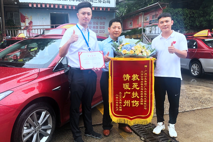 9月4日上午,康復(fù)出院的車主王先生親自來到白云(廣交)公司,向救了自己性命的“的哥”周壽龍贈(zèng)與一面繡有“救死扶傷 情暖廣州”的鮮紅錦旗,并再三致謝!王先生緊緊握著周壽龍的雙手,激動(dòng)地說:“當(dāng)時(shí)我心臟病發(fā)作,連大聲呼喊救命都叫不出來,然而,我只能眼睜睜地看著一輛輛車從旁開過,那時(shí)的感覺,真的很慌、很害怕、很無助……幸好遇到了周師傅!您真是我的救命恩人!”