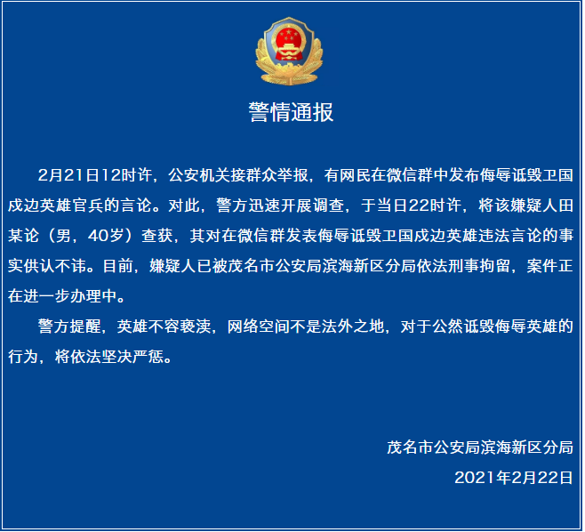 央廣網(wǎng)廣州2月22日消息(記者鄭澍)2月21日12時(shí)許,公安機(jī)關(guān)接群眾舉報(bào),有網(wǎng)民在微信群中發(fā)布侮辱詆毀衛(wèi)國(guó)戍邊英雄官兵的言論。對(duì)此,警方迅速開展調(diào)查,于當(dāng)日22時(shí)許,將該嫌疑人田某論(男,40歲)查獲,其對(duì)在微信群發(fā)表侮辱詆毀衛(wèi)國(guó)戍邊英雄違法言論的事實(shí)供認(rèn)不諱。