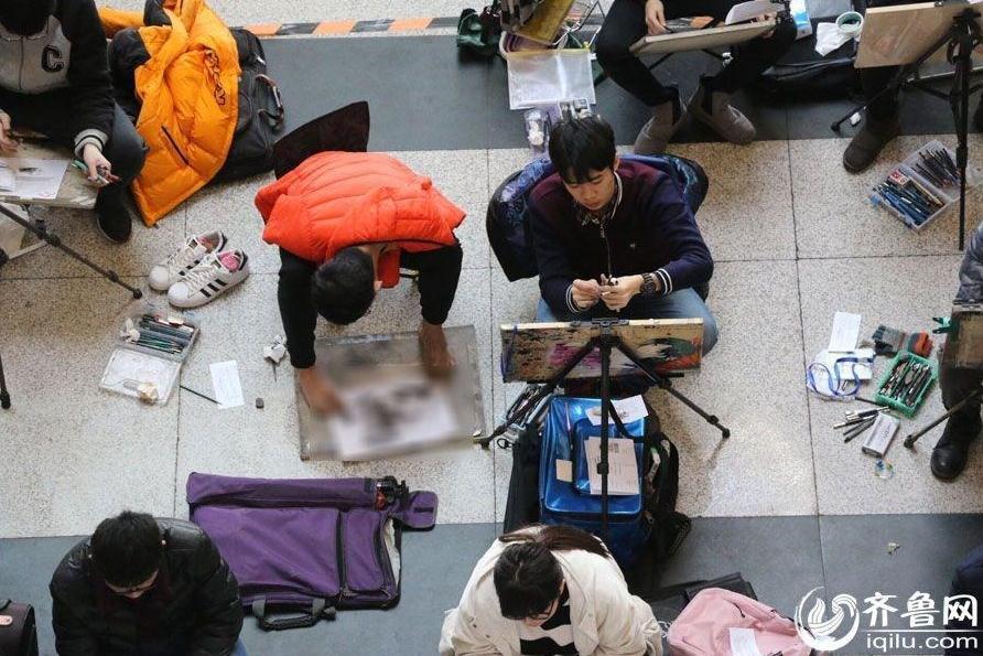 2月16日,2016年山東省藝考?颊嚼_帷幕,在濟(jì)南舜耕國際會(huì)展中心美術(shù)類專業(yè)考場,一位用腳畫畫的學(xué)生引起了記者注意。與其他考生不同的是,他的畫板沒有放在支架上,而是直接放在考場大理石地面上,今天的最高氣溫只有8度,這位考生赤著雙腳完成了考試。圖為一位考生用腳畫畫。 白少光 攝 圖片來源:齊魯網(wǎng)