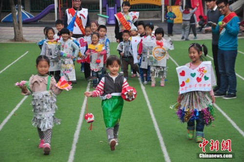 資料圖:2014年10月30日,山東聊城大學(xué)大學(xué)生在附屬幼兒園開展了“勤節(jié)約、點(diǎn)滴起”兒童環(huán)保時(shí)裝秀活動(dòng)。中新社發(fā) 趙玉國 攝