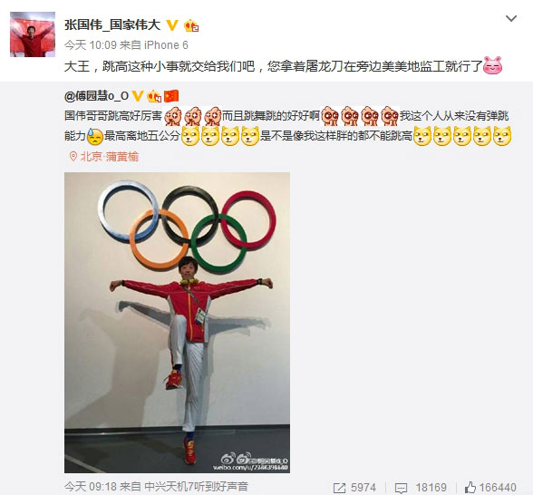 盡管這條微博沒有@張國偉,但是他還是回復(fù)了:“大王,跳高這種小事就交給我們吧,您拿著屠龍刀在旁邊美美地監(jiān)工就行了!睆垏鴤セ貜(fù)的“大王!眮碜杂诖饲案祱@慧的微博,她自我調(diào)侃是大王。